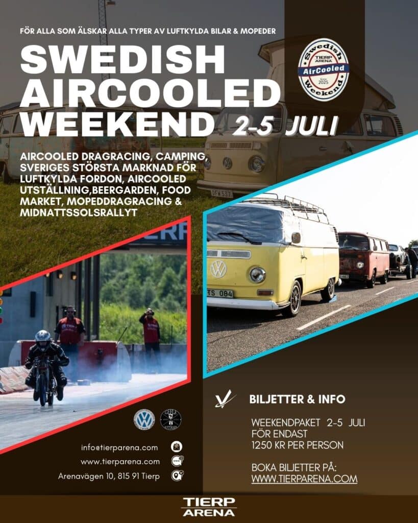 TILL ALLA AIRCOOLED-ENTUSIASTER! Unna dig själv, dina vänner eller familj en fantastisk upplevelse: Biljetter till Swedish AirCooled Weekend 4–6 juli 2025 Tierp Arena I paketet
