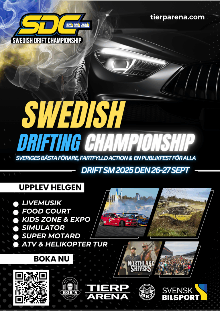 Med denna fredagsbiljett får du också uppleva en hel dag av Drifting SM/JSM/RM – från kl. 09.00 när träningarna för de olika klasserna börjar, till kvalen som pågår mellan kl. 16.00 och 19.00